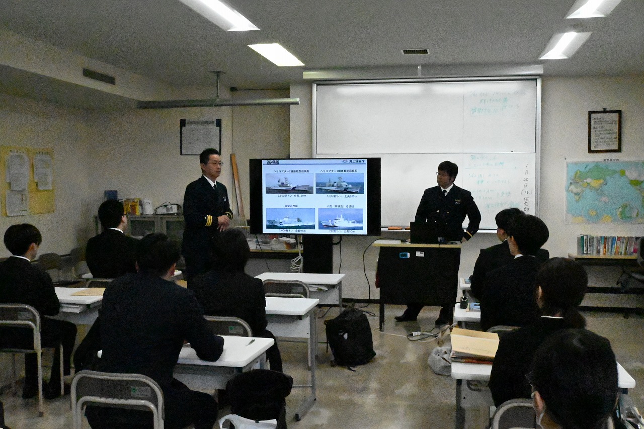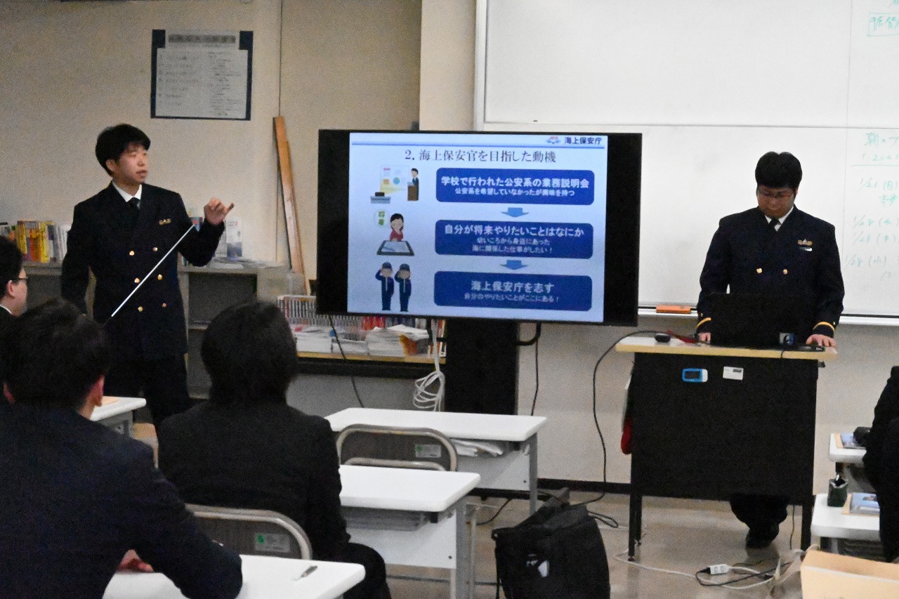 企業説明会を行っていただきました!! / 最新情報 / By komaki 青森県警察本部サイバー犯罪対策課の方と海上保安庁八戸海上保安部の方に来ていただき、1年生に業務内容を説明してもらいました。 海上保安庁にいる卒業生も来てくれました。大変参考になりました。お時間いただきありがとうございます!